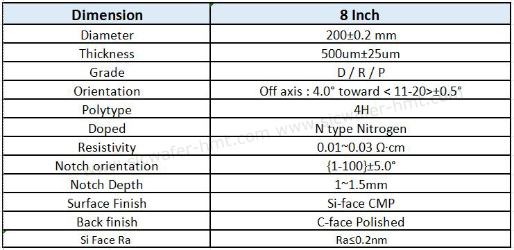 Buy SiC wafer from China Manufacturer and Supplier can select HMT company. We are the professional 8inch SiC Wafer Supplier with many years experiences for SiC wafer produce. Both N-type and SI-type SiC Wafer are available in HMT. N-type means conductive type, doped with Nitrogen and resistivity is 0.015-0.025ohm.cm, SI-type means semi-insulating type, un-doped and resistivity is ≥1E7ohm.cm. For 8” SiC Wafer, we always provide competitive price but high quality to clients. They are willing to cooperate with us cause we are a reliable 8inch SiC Wafer Supplier.